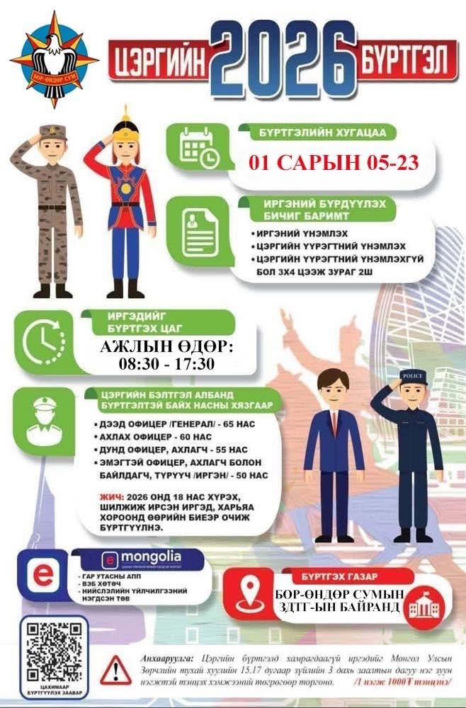 Бор-Өндөр суманд 2026 оны цэргийн бүртгэл 01-р сарын 05-23-ыг дуустал явагдах тул 18-50 насны эрчүүд, 65 нас хүртэлх бэлтгэл офицер, ахлагч, цэргийн мэргэжил бүхий эмэгтэйчүүд та бүхэн дээрх хугацаанд цэргийн бүртгэлдээ хамрагдахыг мэдэгдье.