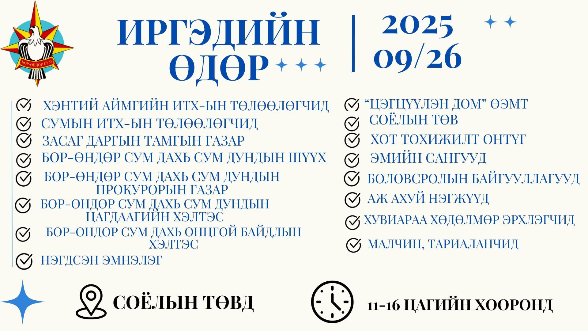 Сумын Иргэдийн Төлөөлөгчдийн хурал болон Засаг даргын Тамгын газар хамтран “Иргэдийн өдөр-2025” арга хэмжээг 2025 оны 09 дүгээр сарын 26-ны өдөр 11-16 цагийн хооронд Соёлын төвд зохион байгуулна.