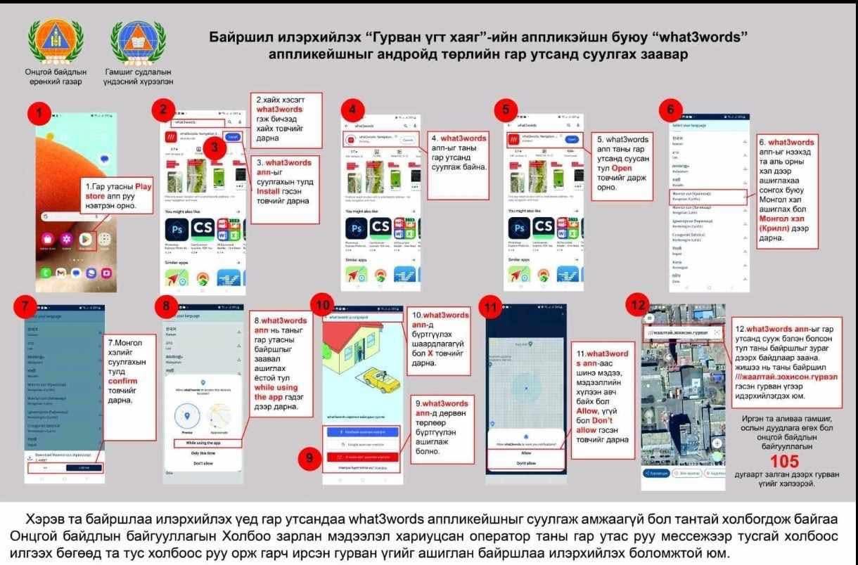 Дуудлага өгч байгаа иргэн оршин суугаа хаягаа мэдэхгүй, координат өгөх боломжгүй тохиолдолд өөрийн ухаалаг гар утсан дээрээ интернэттэй болон интернэтгүй үед “what3word” программыг ашиглан 3 үгт хаягаа ирүүлснээр дуудлагын байршлыг нарийвчлалтайгаар тогтоох боломжтой юм.