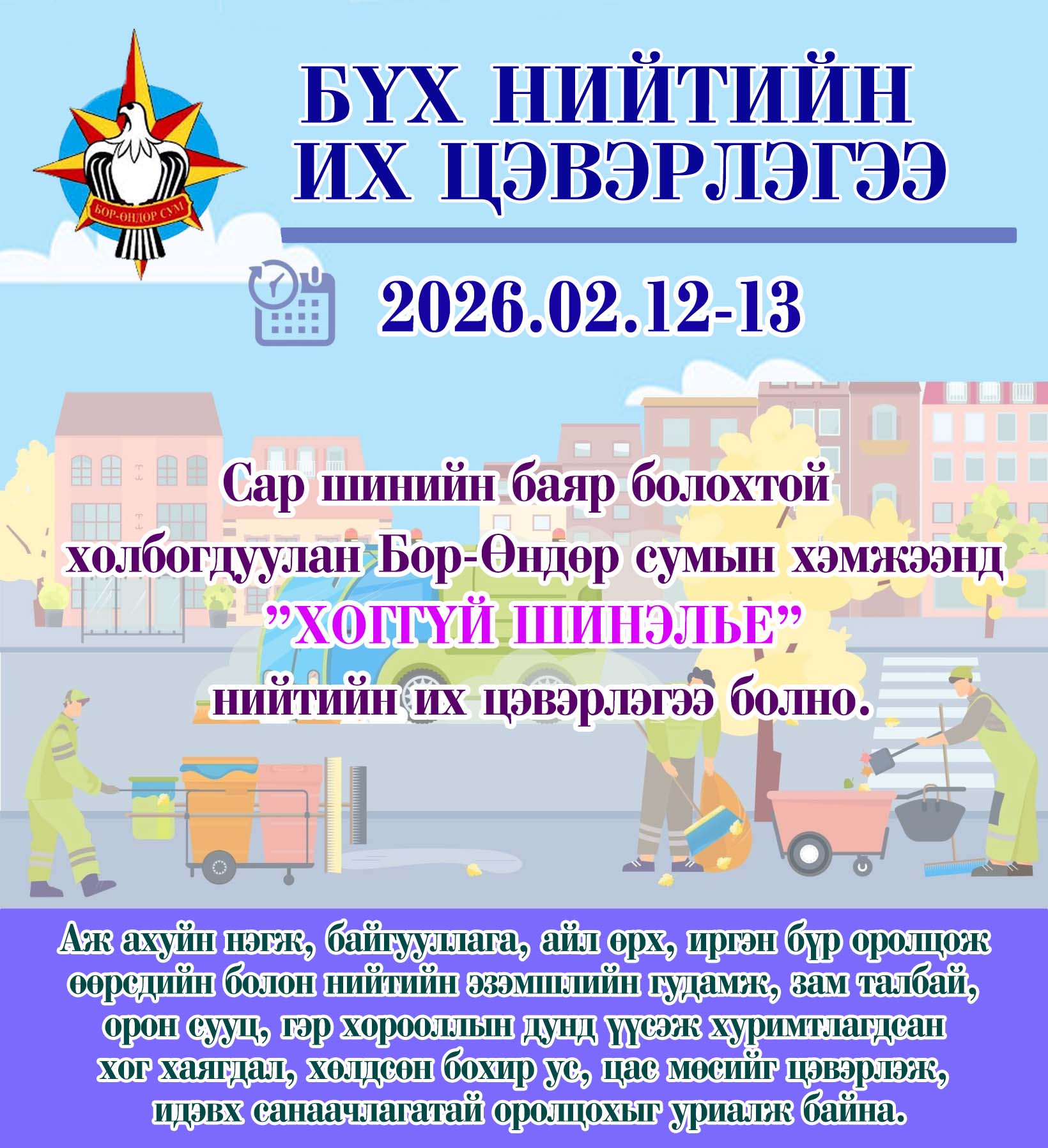 Бор-Өндөрчүүд сар шинийн баяраа хоггүй, цэвэр орчинд угтахаар зохион байгуулагдах бүх нийтийн их цэвэрлэгээ 2026 оны 02 сарын 12, 13-ны өдөр болно.