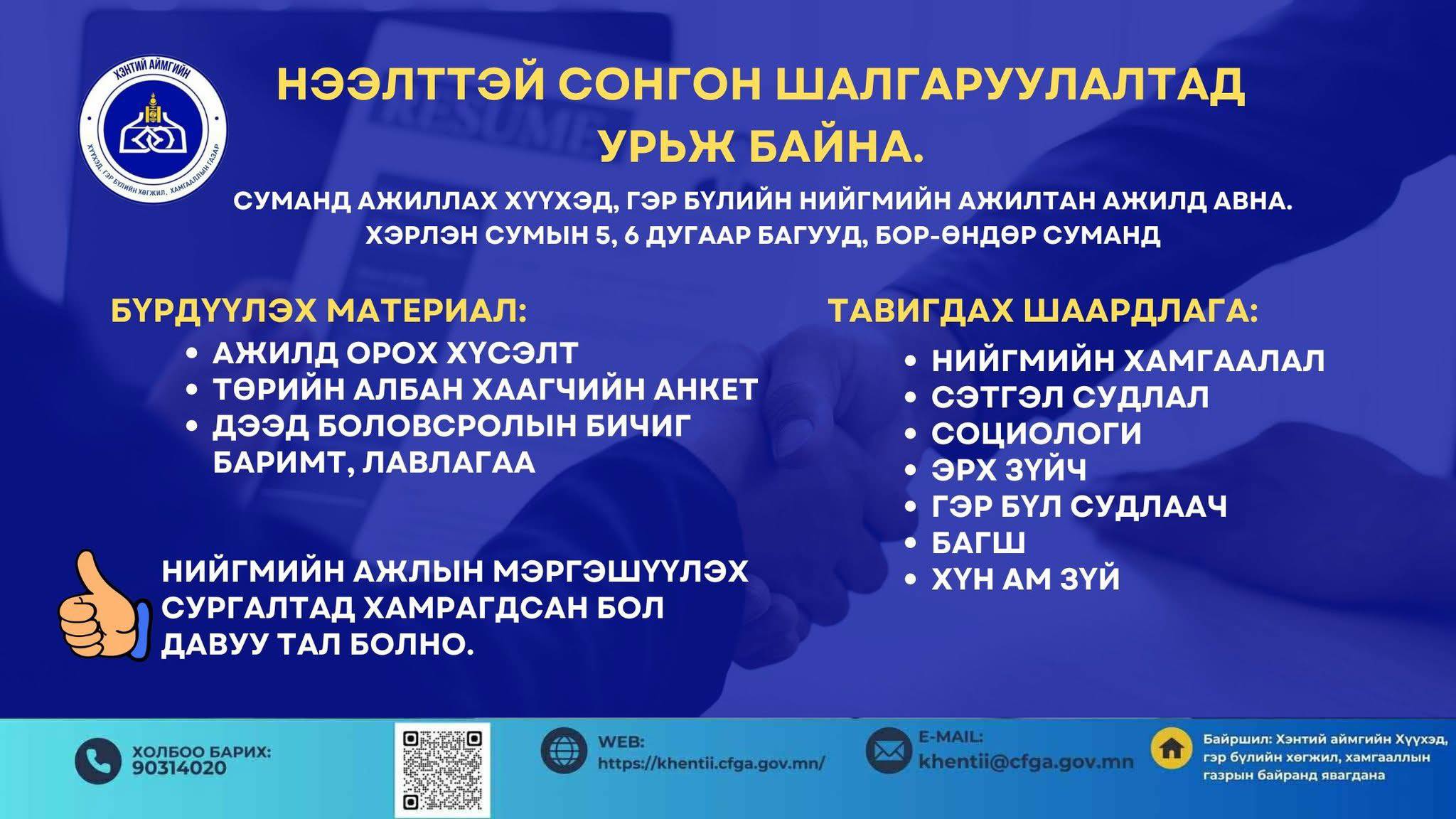 Хэнтий аймгийн Хүүхэд, гэр бүлийн хөгжил, хамгааллын газарт хүүхэд, гэр бүлийн нийгмийн ажилтан сонгон шалгаруулж ажилд авна.