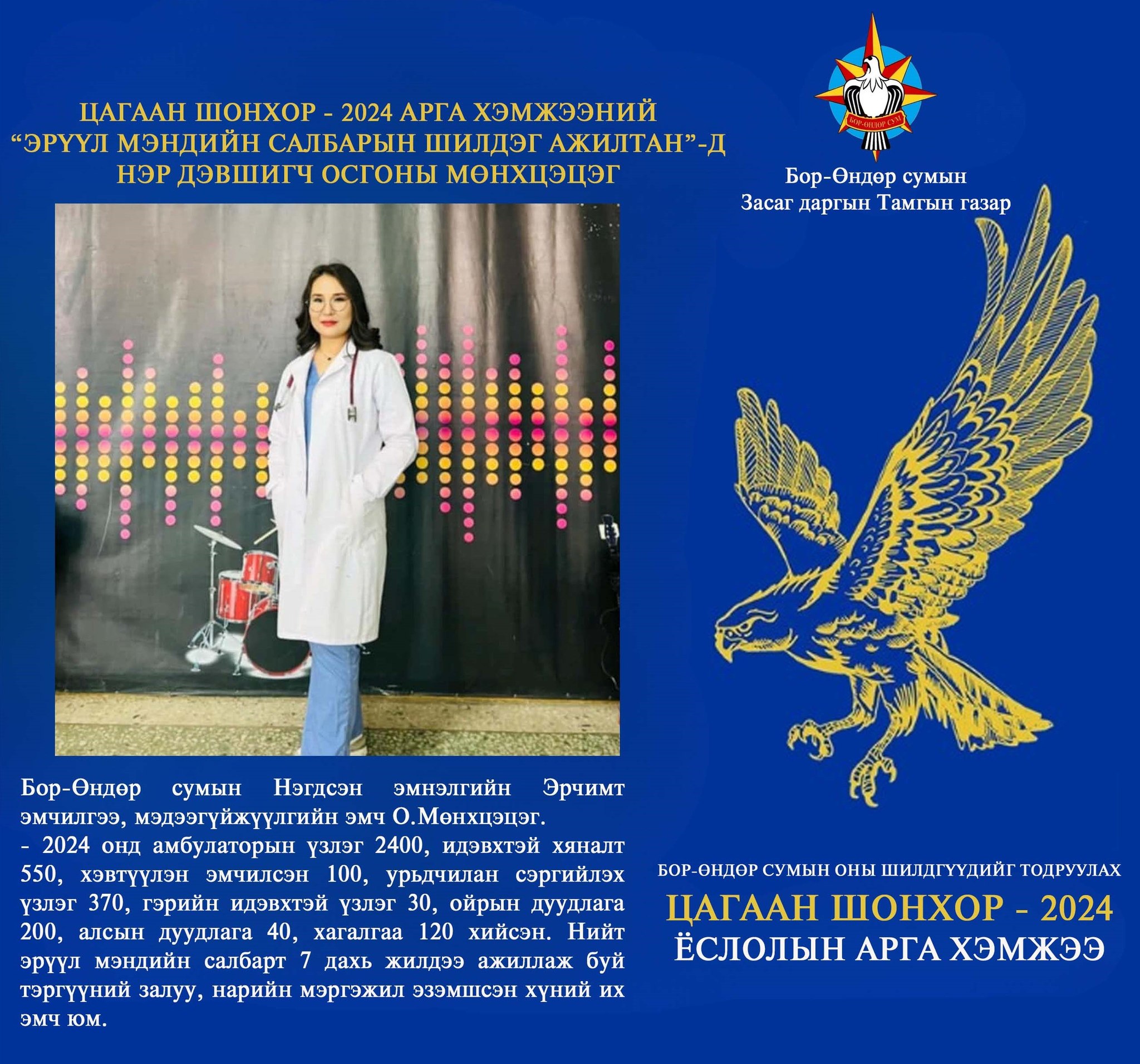 Бор-Өндөр сумын Оны шилдгүүдийг тодруулах "Цагаан шонхор - 2024" ёслолын арга хэмжээний "Эрүүл мэндийн салбарын шилдэг ажилтан" Осгоны Мөнхцэцэг.