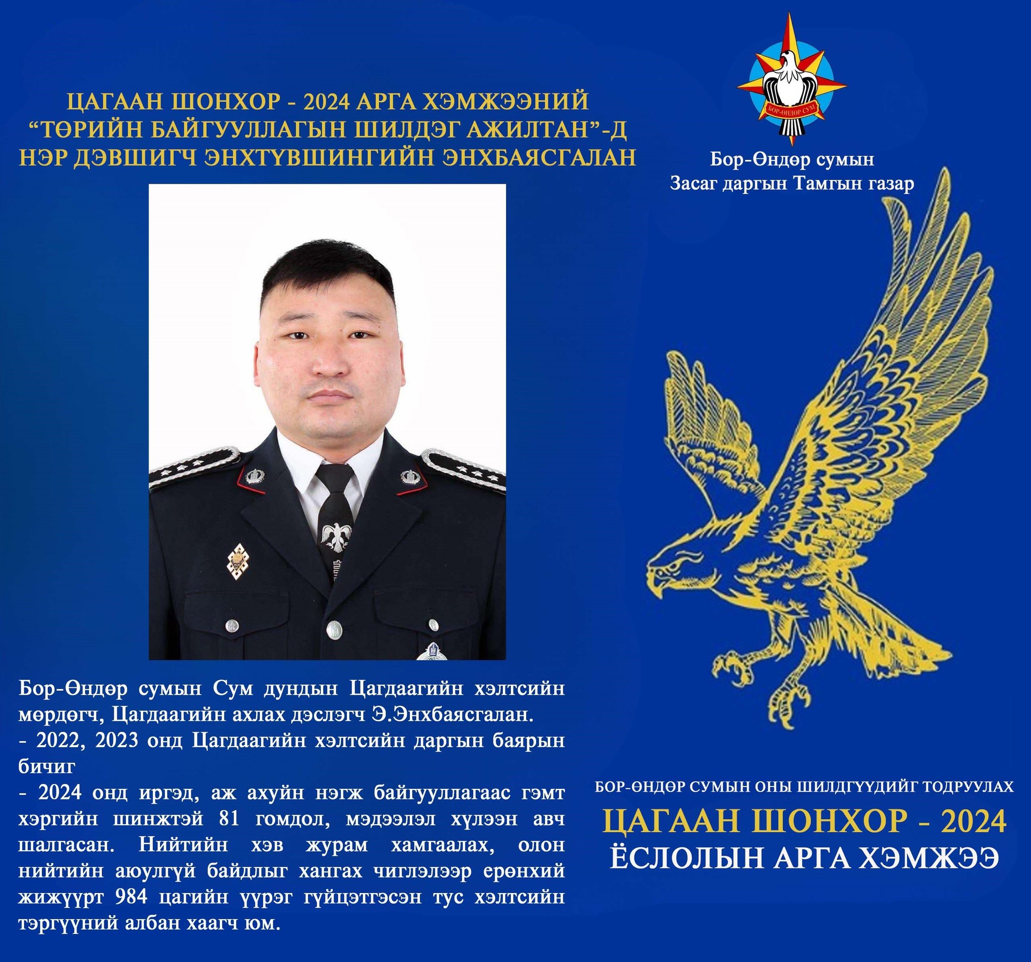Бор-Өндөр сумын Оны шилдгүүдийг тодруулах "Цагаан шонхор - 2024" ёслолын арга хэмжээний "Төрийн байгууллагын шилдэг ажилтан" Энхтүвшингийн Энхбаясгалан.